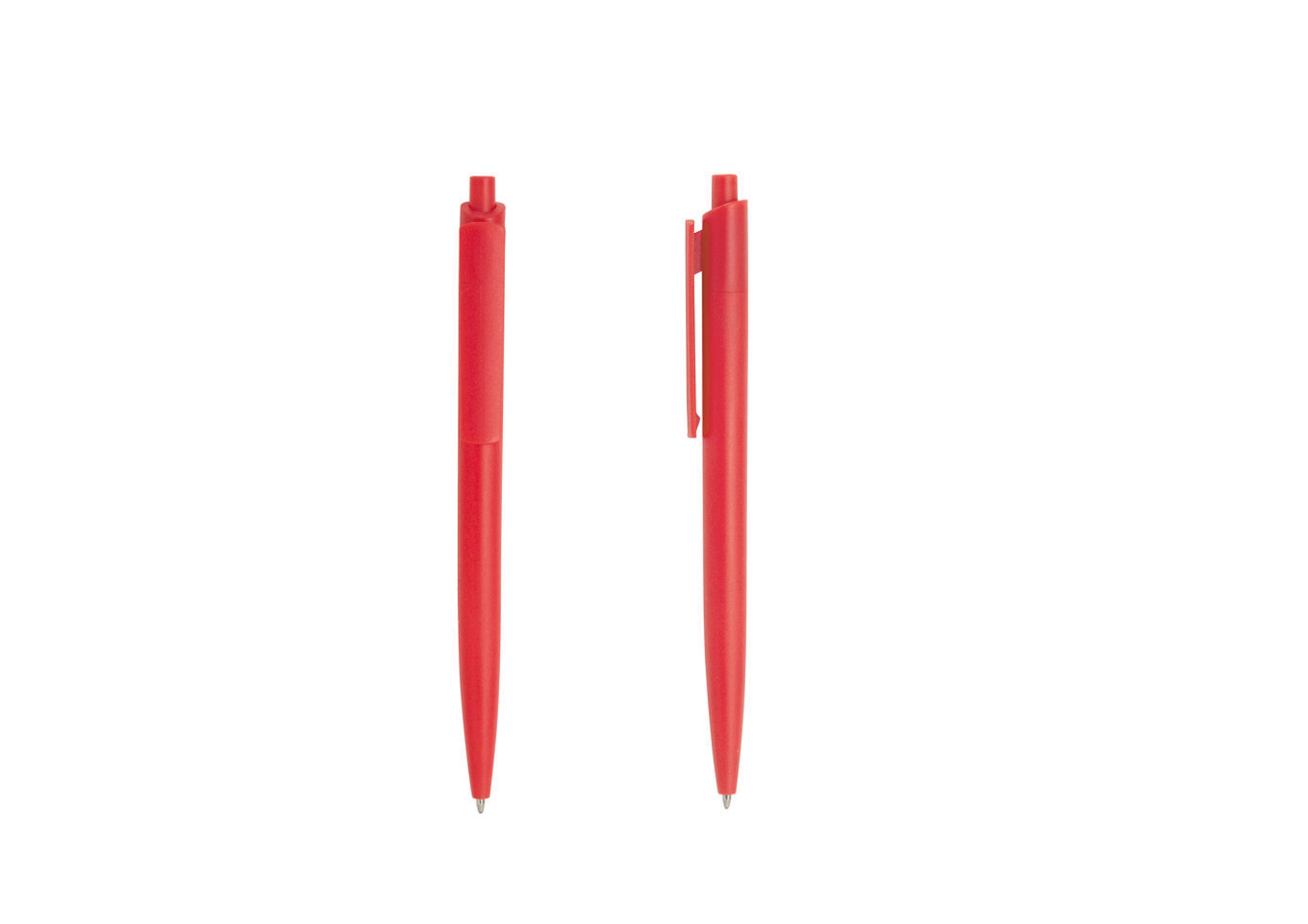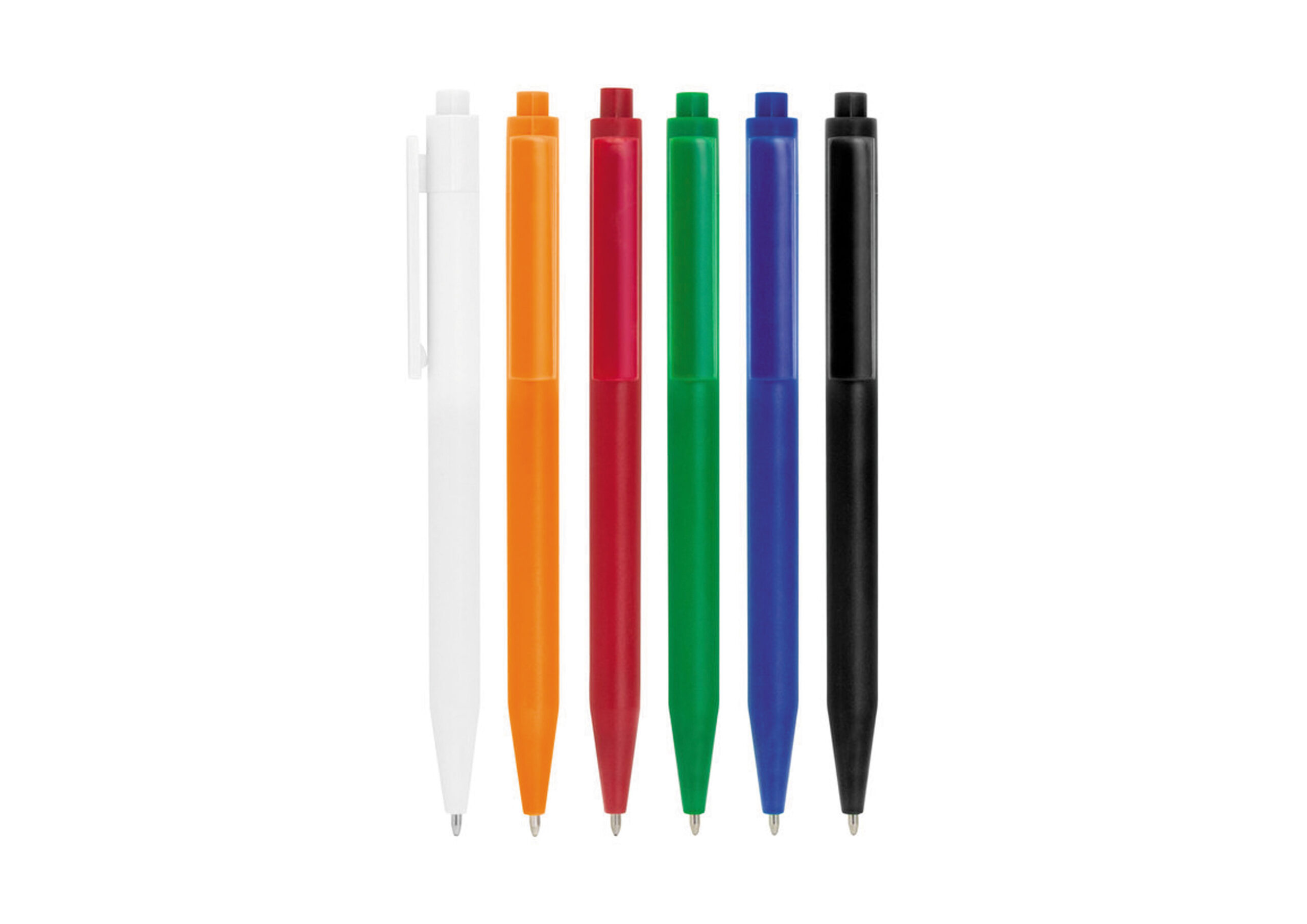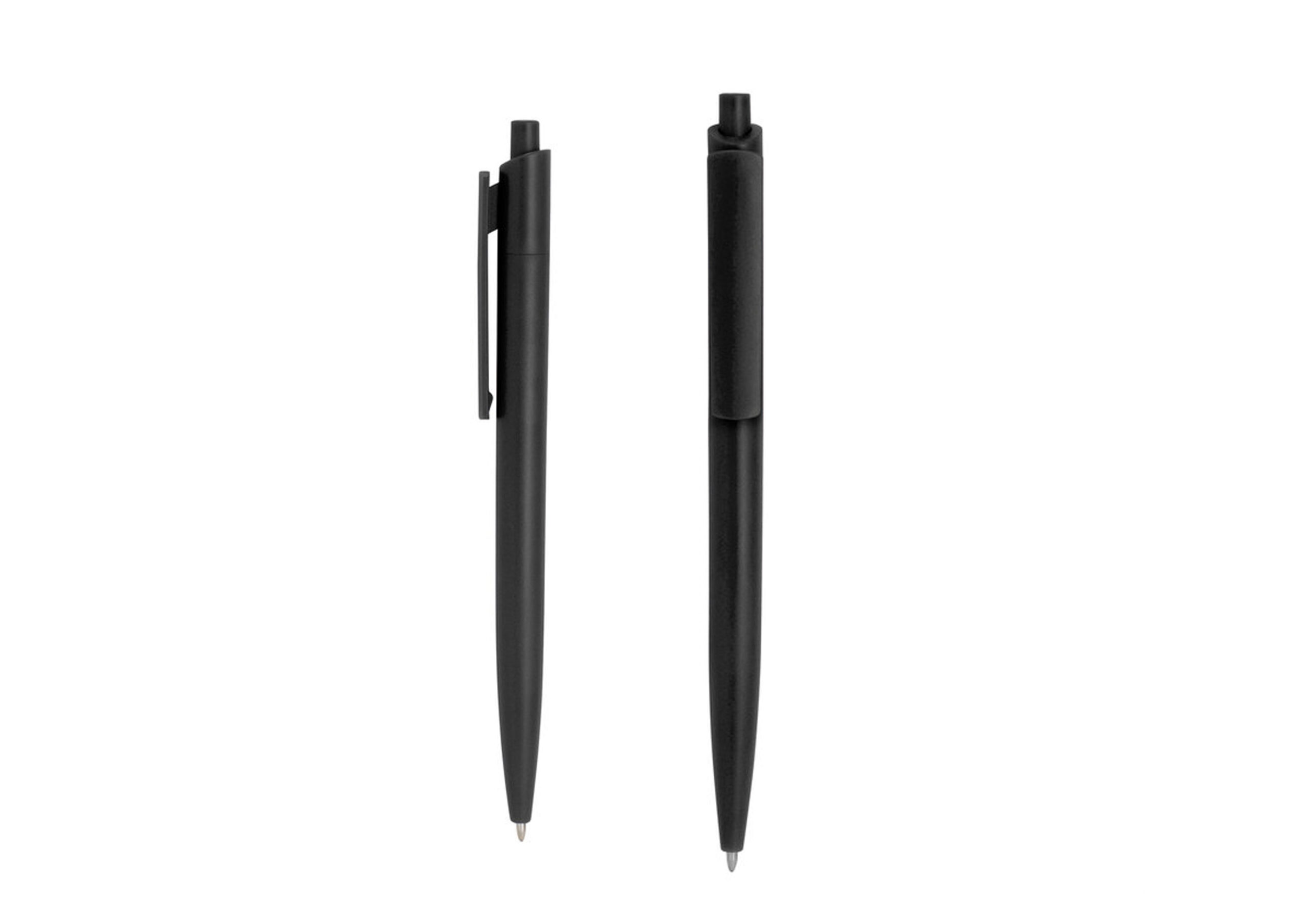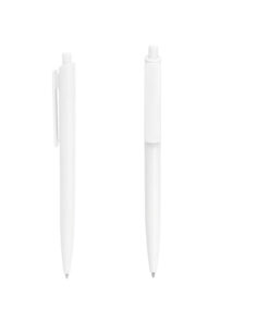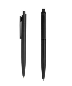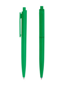 Plástico ABS. Bolígrafo retráctil. Cuerpo y clip plásticos del mismo color, cuerpo acabado mate y clip acabado brillante. Tinta negra. Amplia área de impresión.