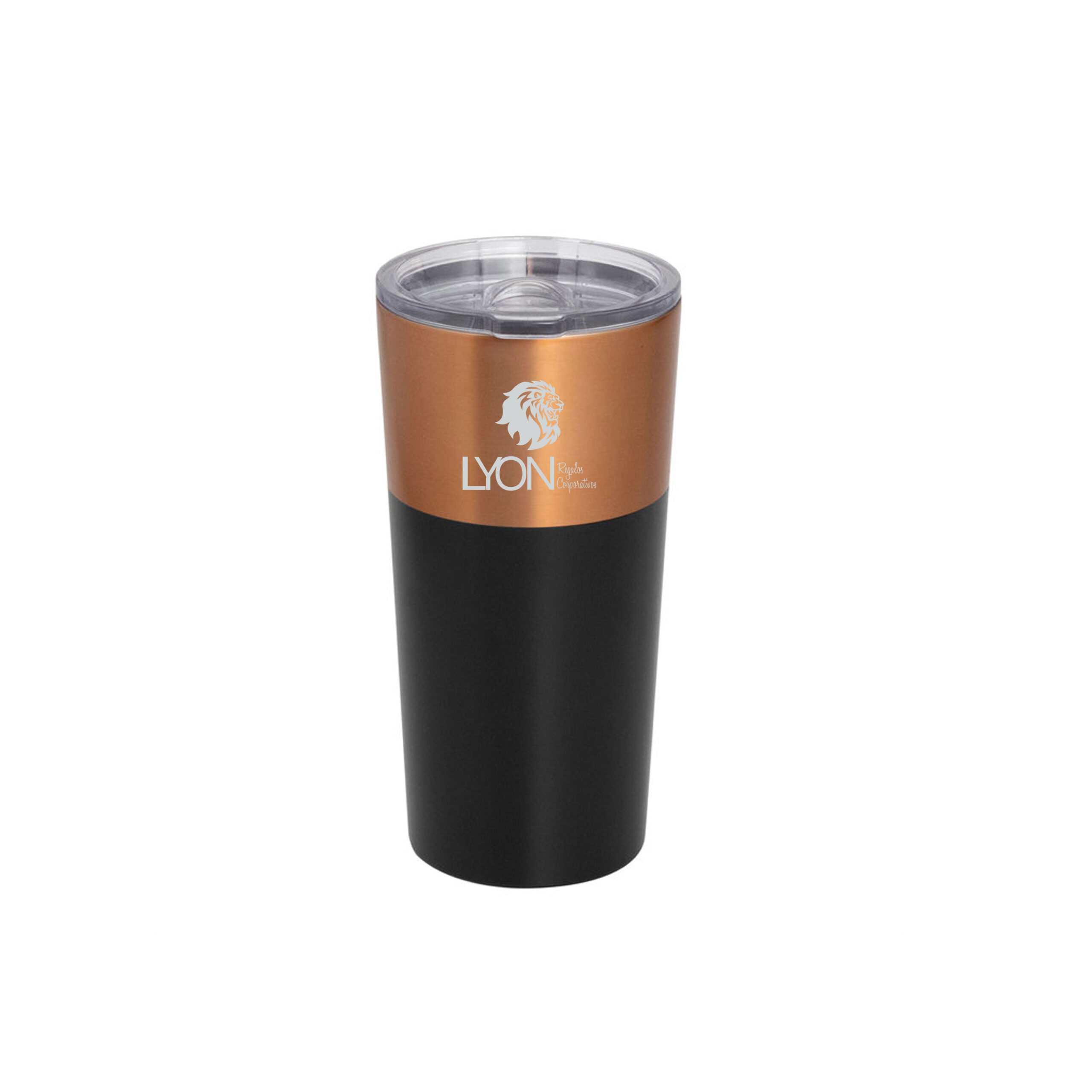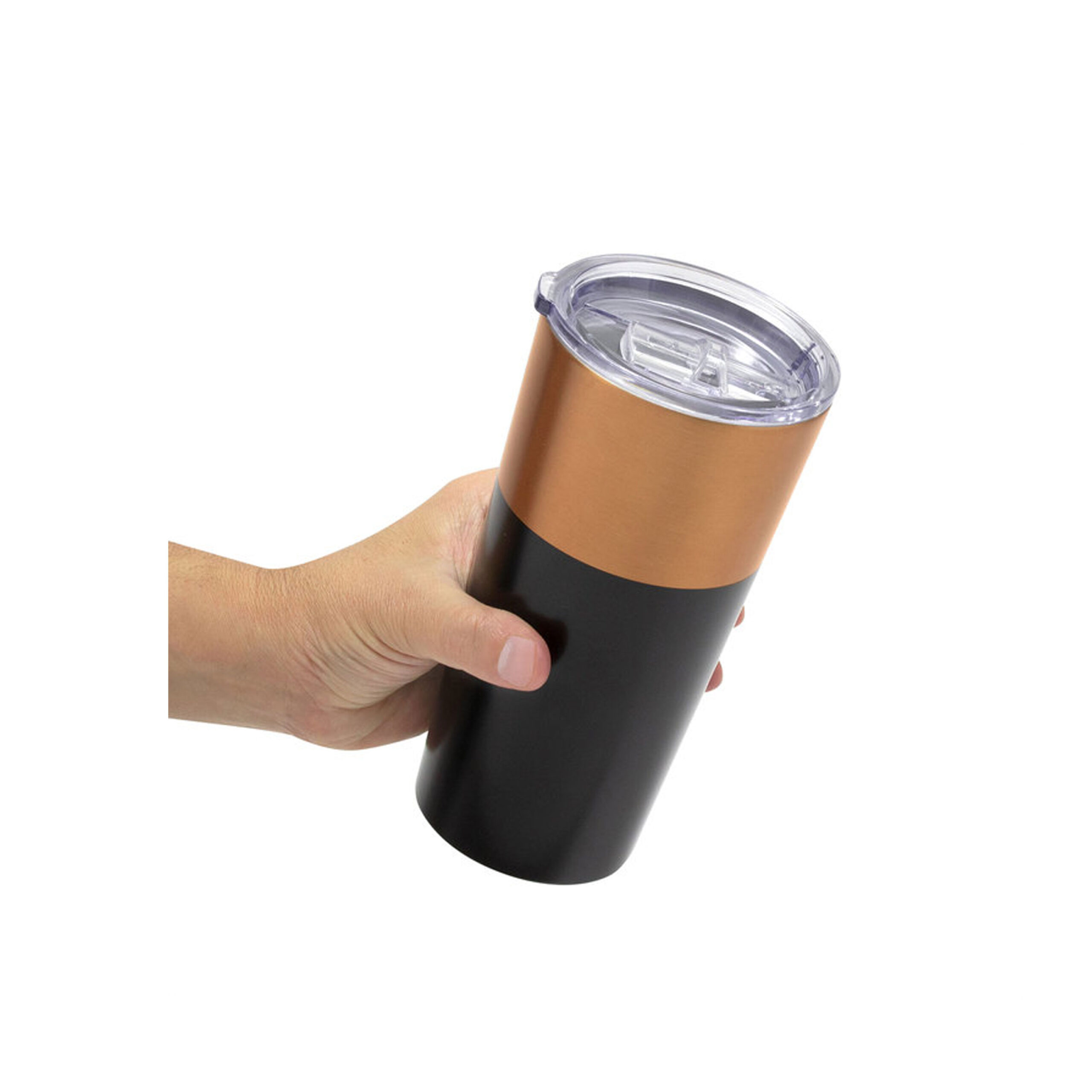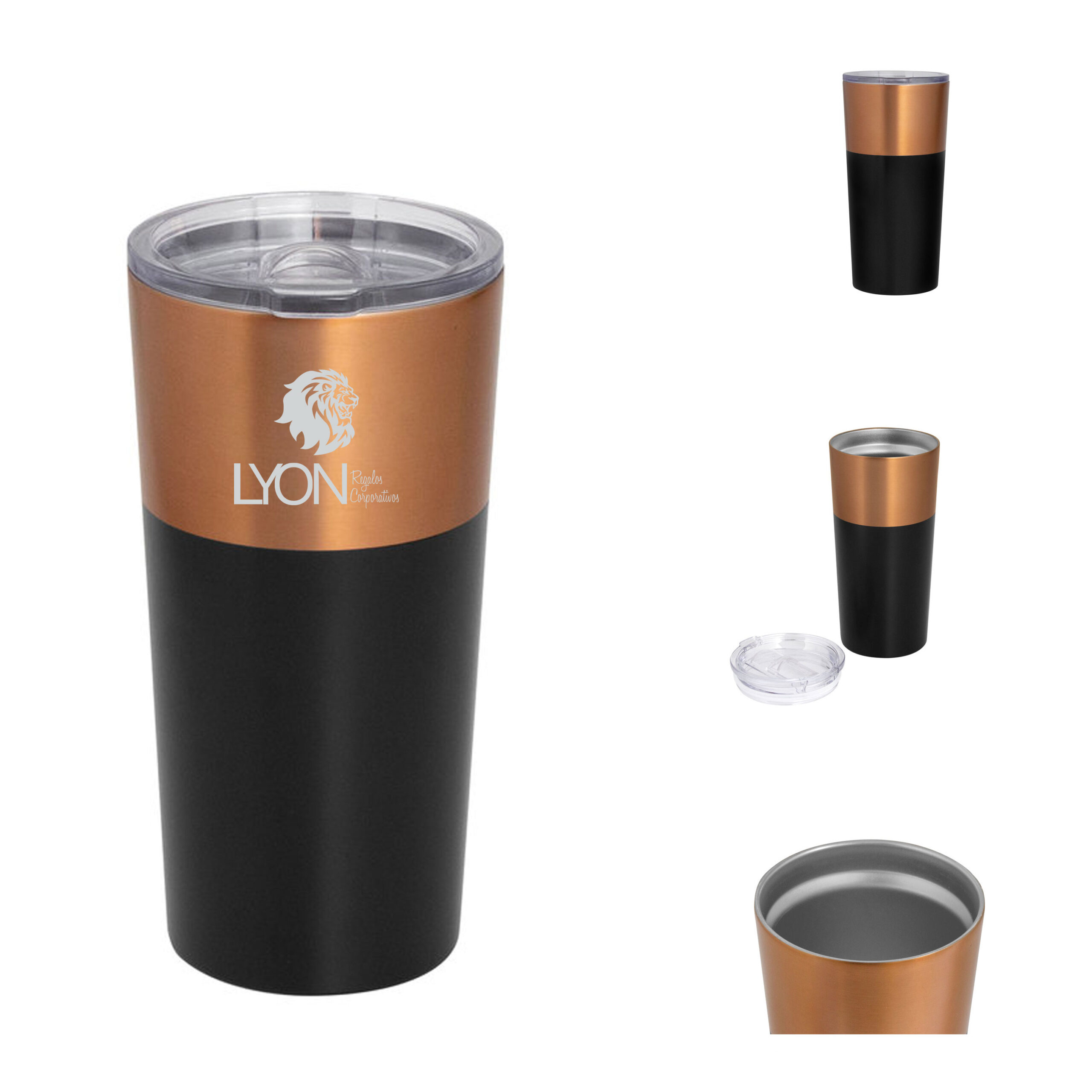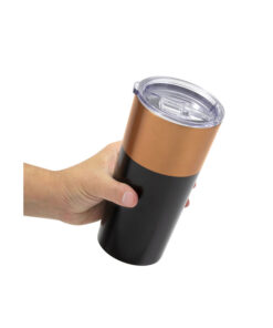. Acero inoxidable. Mug doble pared, sellado al vacío. Interior en acero 304 y exterior en acero 201. Tapa plástica transparente a presión con boquilla, seguro antivuelco y anillo de silicona antiderrame. Pintura exterior con acabado mate en color negro y cobre.
